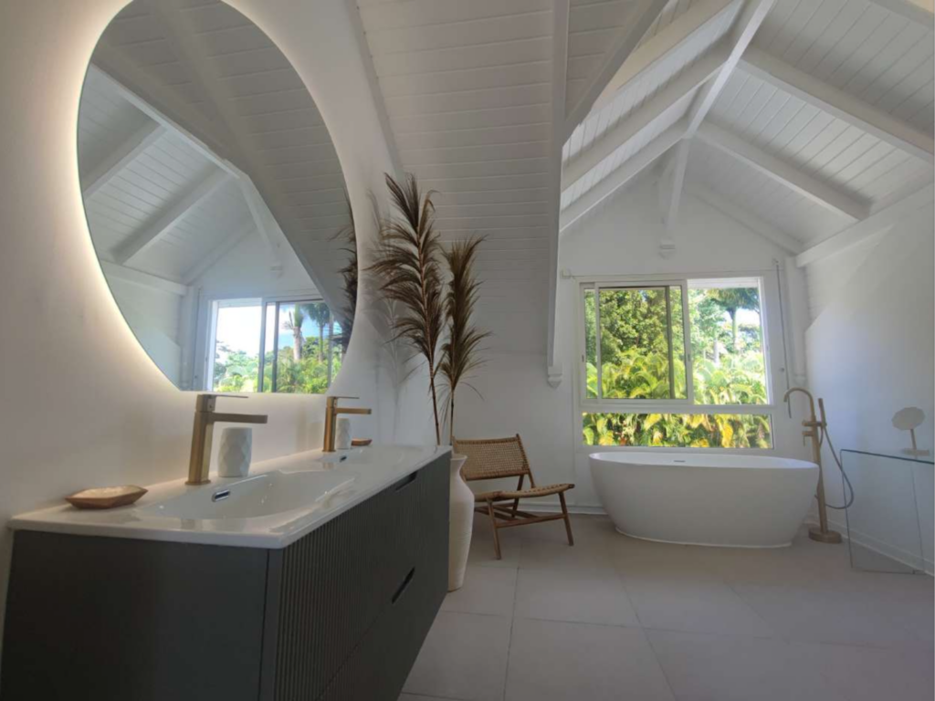 La salle de bains, élégante et lumineuse, allie confort moderne et touches tropicales.